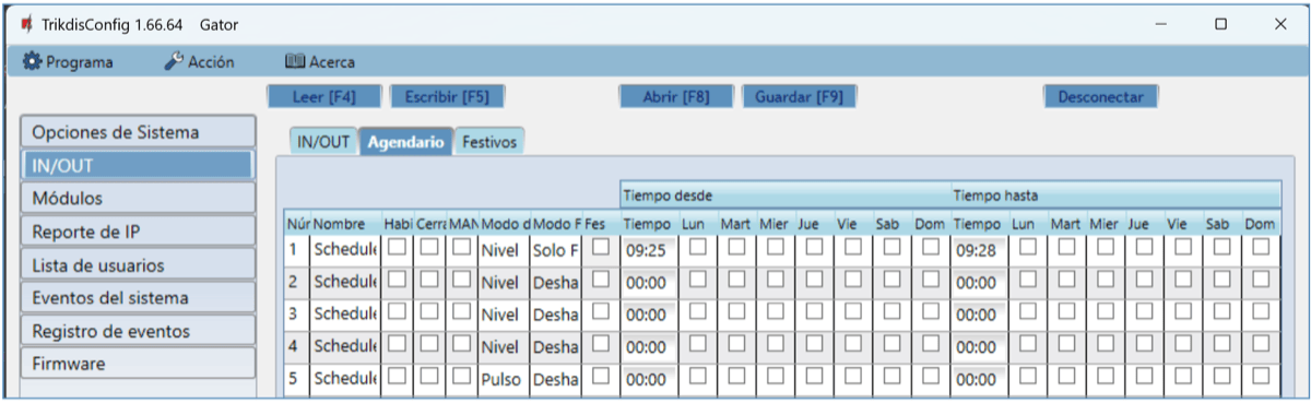 El usuario puede controlar las salidas de acuerdo con el “Agendario” establecido. El “Agendario” debe asignarse al usuario.