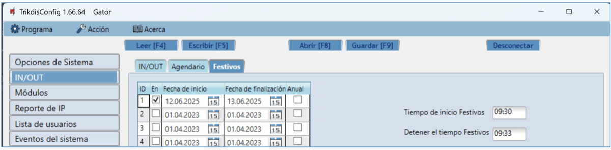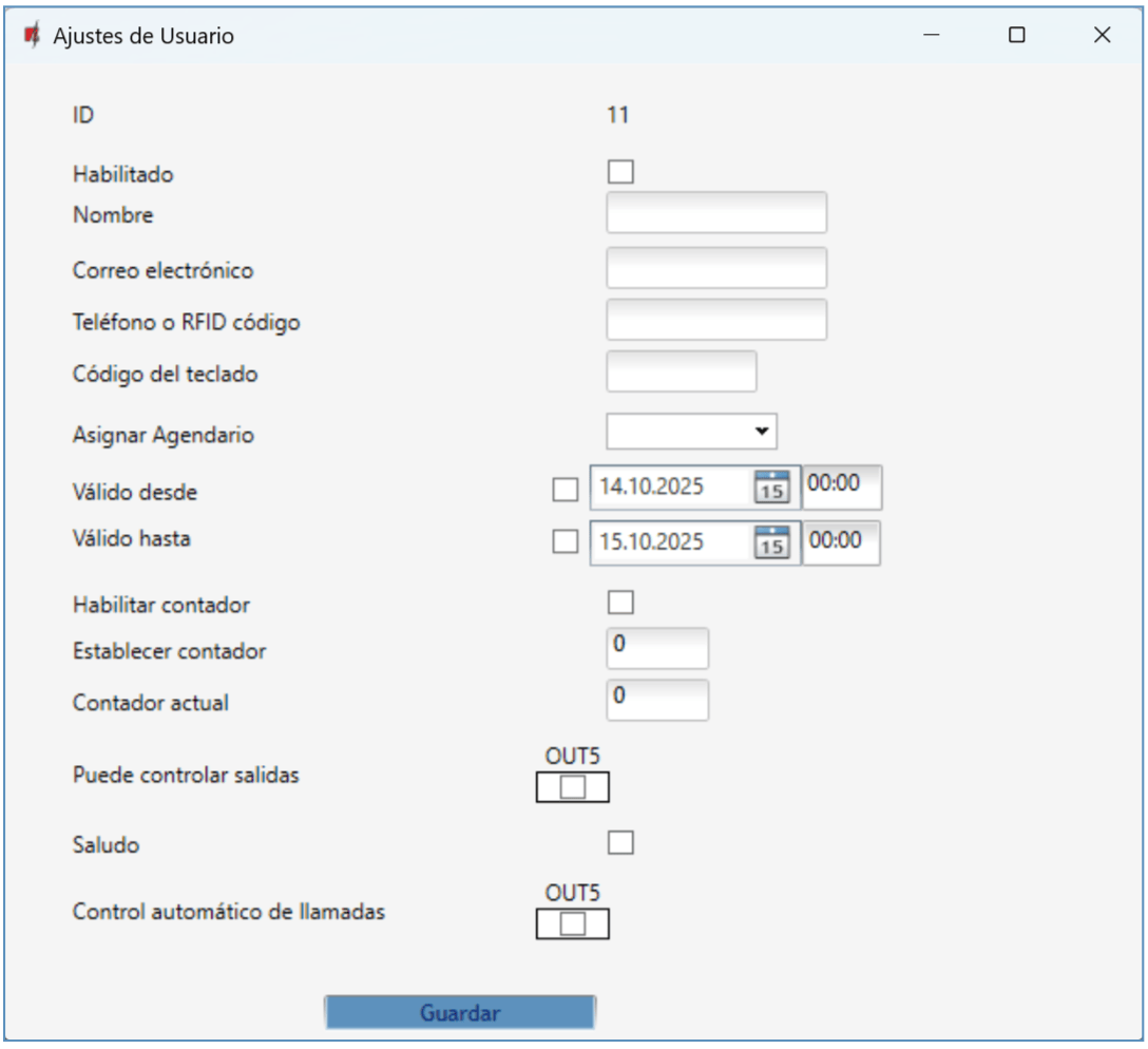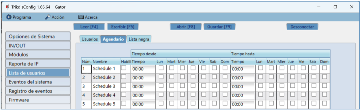 Asignar Agendario – al usuario se le asigna el número del horario (los números de horario y sus configuraciones se establece en la pestaña "Agendario"), cuando el usuario puede controlar las salidas OUT.