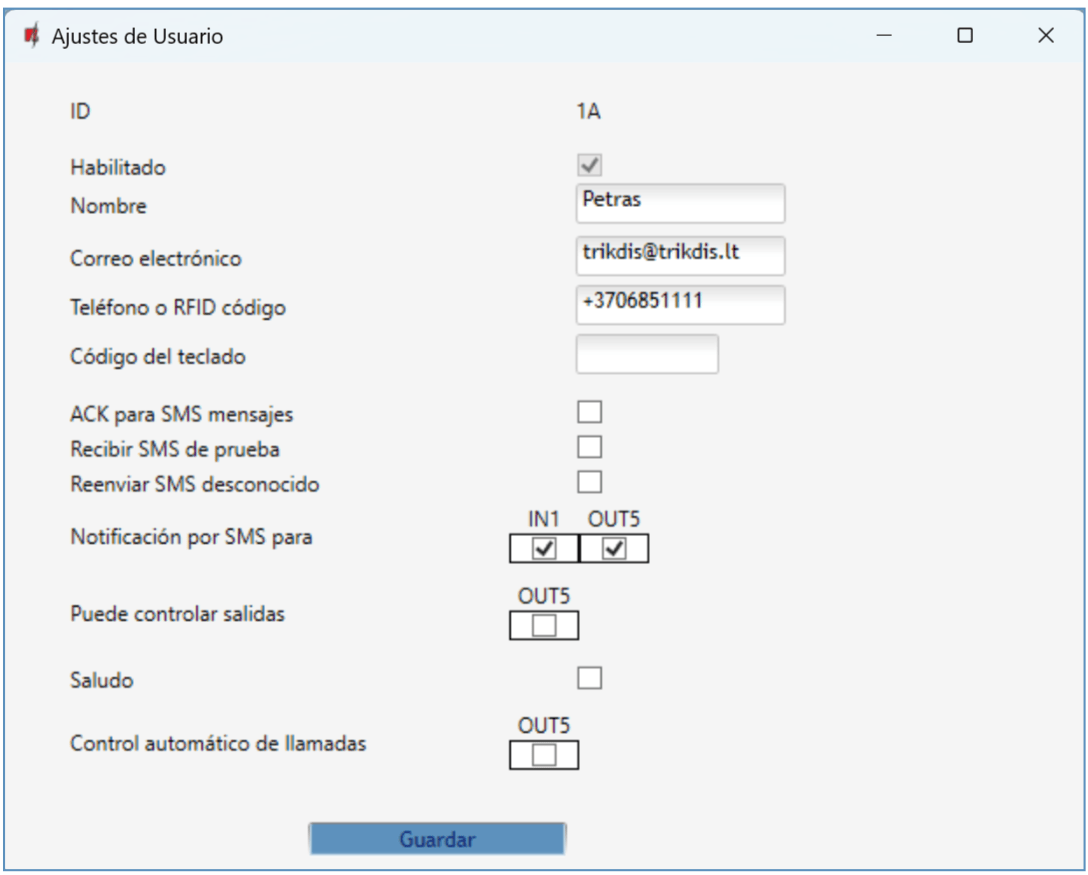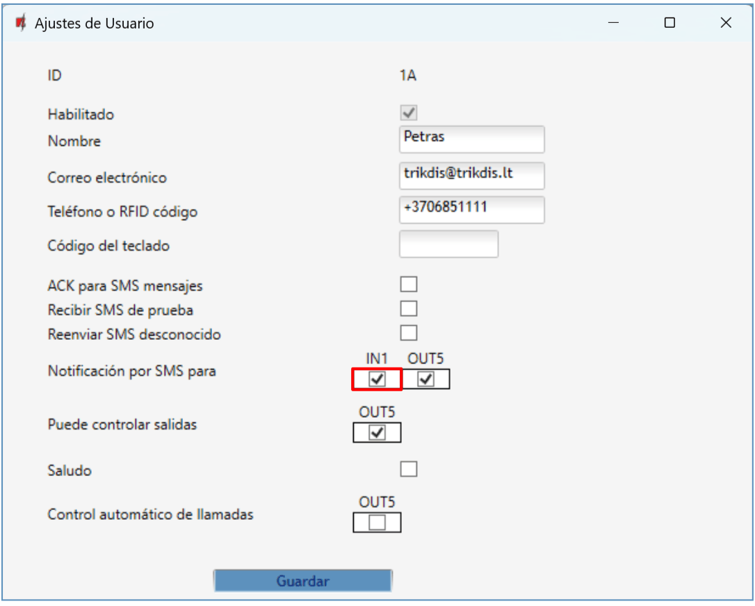 En la ventana "Lista de Usuarios", marque la casilla IN1 si desea que el usuario reciba mensajes SMS sobre el estado del portón. Clic en “Guardar”.