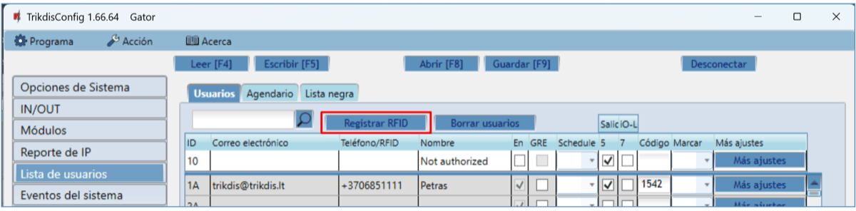 Haga clic en “Registrar RFID” en la ventana "Lista de usuarios".