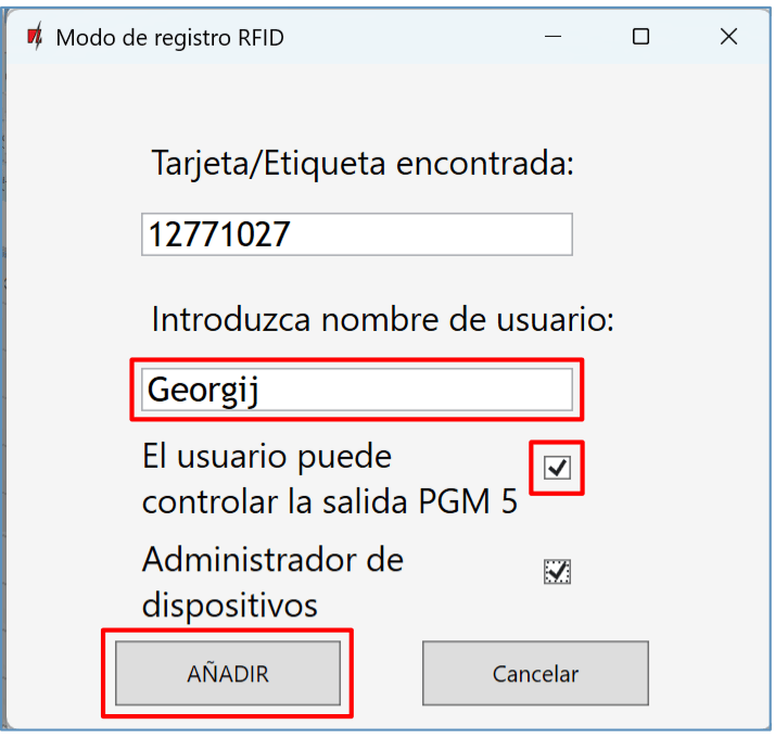Conecte el colgante RFID (tarjeta) al lector RFID. Se abrirá una nueva ventana cuando el lector escanee el colgante (tarjeta). En él, ingrese el nombre de usuario y seleccione que “El usuario puede controlar la salida PGM 5”. Presione el botón “AÑADIR”. / Repita los pasos anteriores para agregar más tarjeta colgante RFID (tarjetas). Cuando se complete el registro de todos los colgantes (tarjetas) RFID, presione el botón “STOP el registro”. / Presione el botón Escribir [F5] para guardar la lista pendiente de RFID en el controlador.