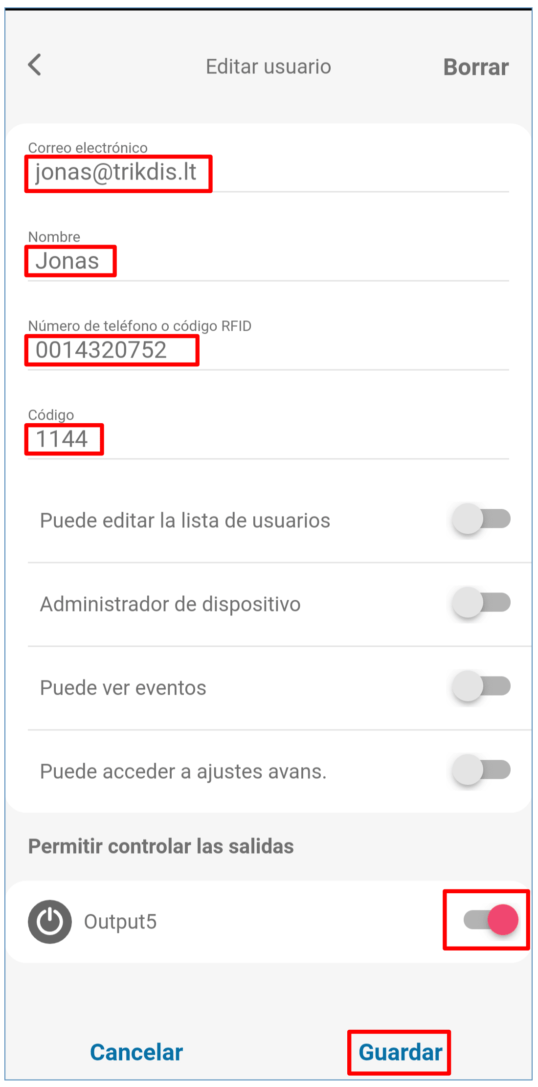 Puede controlar salidas - marque el número de salida que será controlado por el administrador.