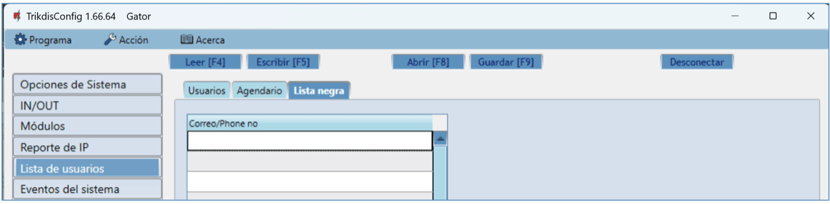 La “Lista negra” contiene direcciones de correos electrónicos, números de teléfonos de usuarios, números de ID del RFID colgante (tarjeta), que están excluidos de controlar el controlador.