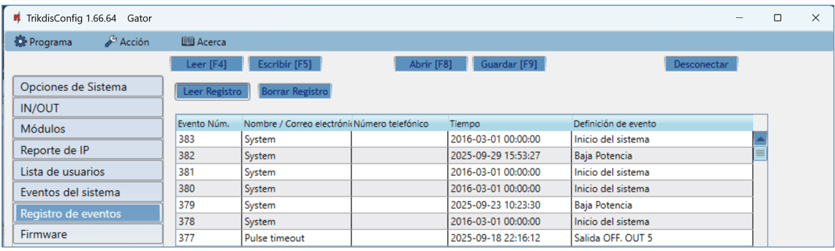 Haga clic en el botón “Leer Registro”. El registro de eventos se leerá desde la memoria del controlador. El registro de eventos proporciona información sobre las acciones del controlador y sus eventos internos.