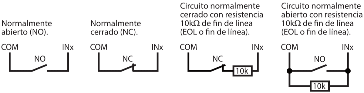 | Entradas | 2, tipo seleccionable: NC, NO, EOL = 10 kΩ |