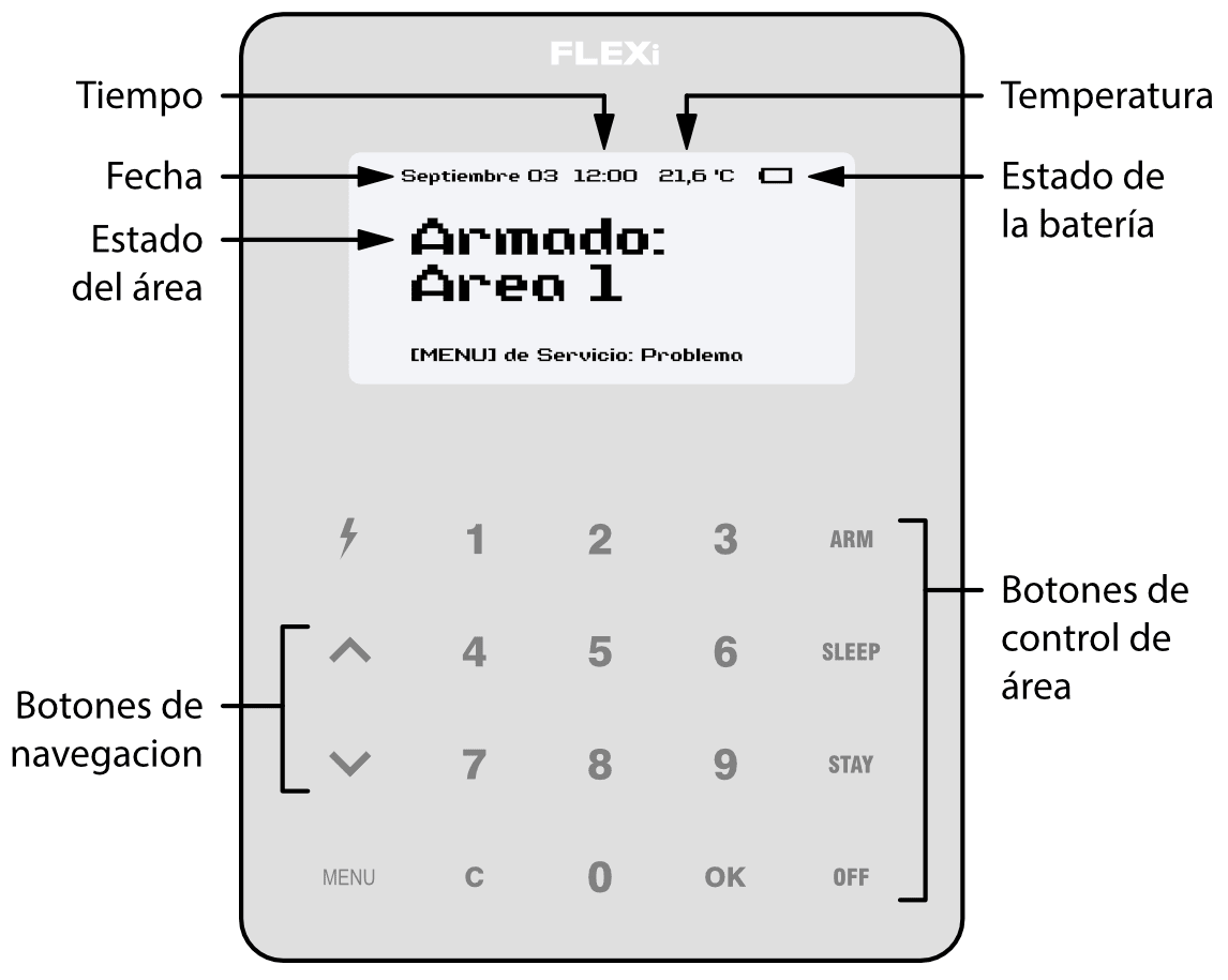 El teclado SK-LCD TouchPad para control del sistema de alarma muestra los estados de 64 zonas y 8 participaciones. Además, el teclado SK-LCD TouchPad se puede asignar para controlar una o más áreas deseadas (versión del programa operativo del teclado desde FW:1.41, versión del programa operativo del panel de control desde FW:SP3_xxx4_0119. La versión del firmware del teclado se puede ver presionando MENU 5 0). El teclado mostrará los estados del área asignada y de las zonas del área.
