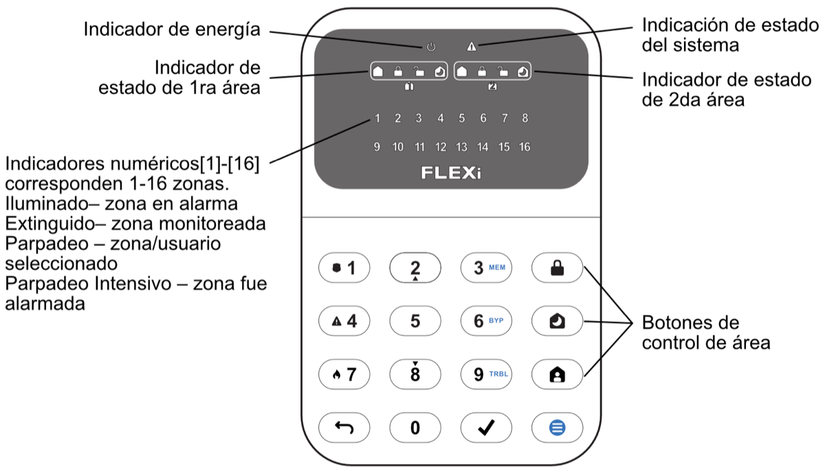 El teclado “SK-LED button” para el control del sistema de alarma muestra los estados de 16 zonas y 2 particiones. Además, el teclado “SK-LED button” puede asignarse para controlar una o dos áreas deseadas (versión de firmware del teclado desde FW:1.0, versión de firmware del panel de control desde FW:SP3_xxx4_0120). El teclado mostrará los estados del área asignada y de las zonas del área.