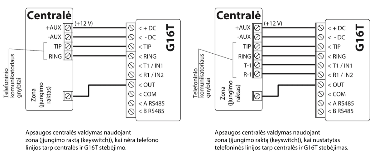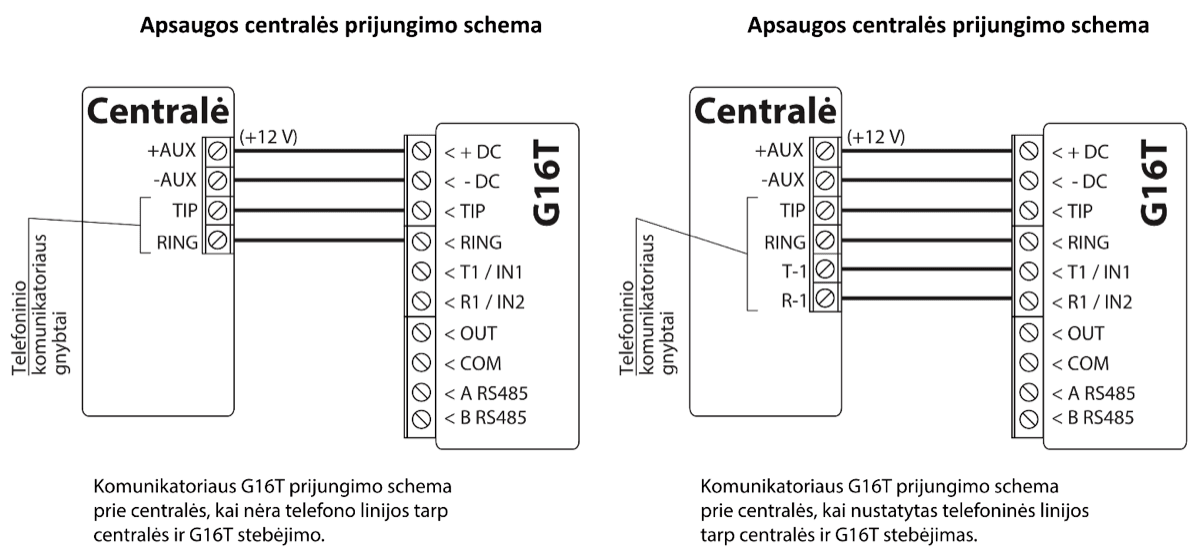Mobilaus ryšio komunikatorius G16T gali būti prijungtas prie bet kurios apsaugos centralės, kuri turi telefoninį komunikatorių ir palaiko siuntimą Contact ID protokolu DTMF tonais.