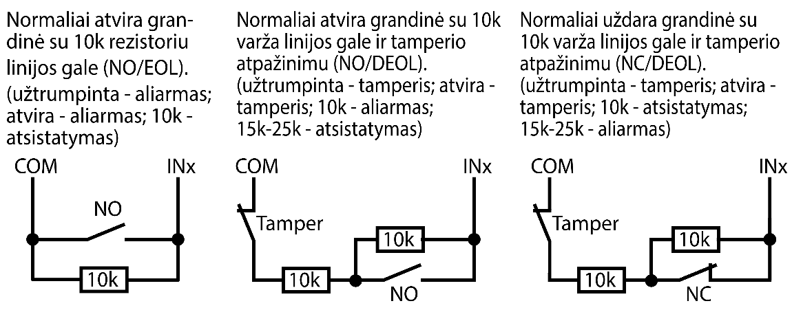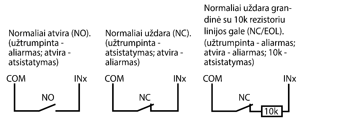 2 pasirenkamo tipo įėjimai, tipai: NC; NO; NC/EOL; NO/EOL; NC/DEOL; NO/DEOL.