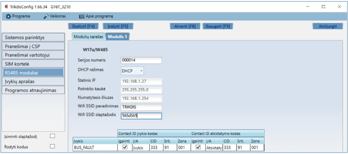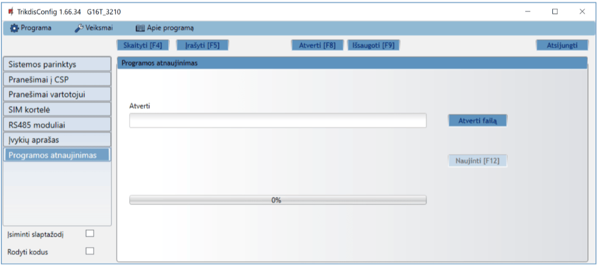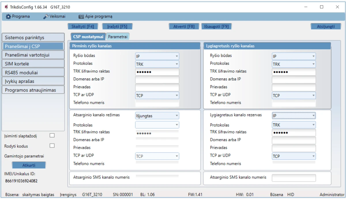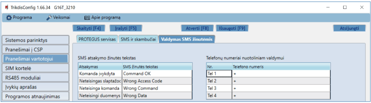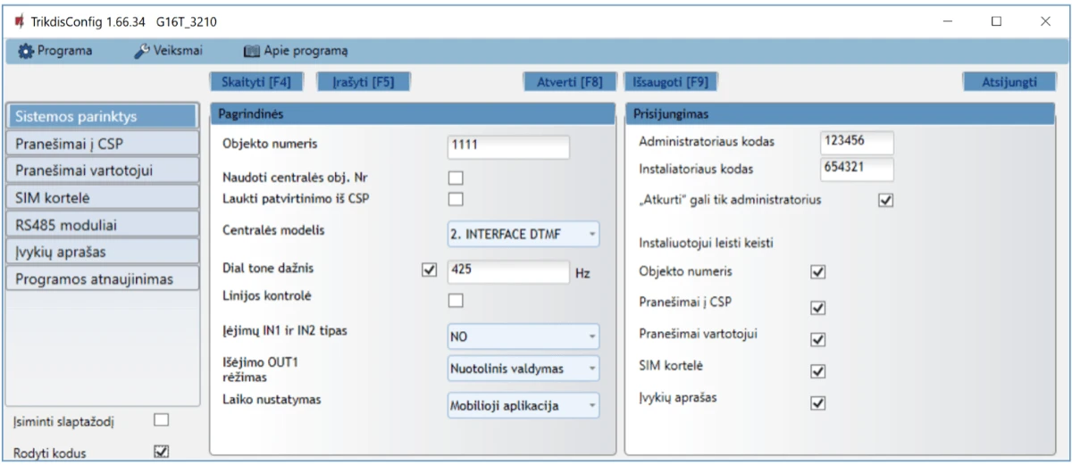 | Veikimo konfigūravimas | Su kompiuterio programa TrikdisConfig nuotoliniu būdu arba lokaliai per USB Mini-B. / Nuotoliniu būdu SMS žinutėmis. |