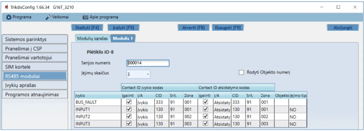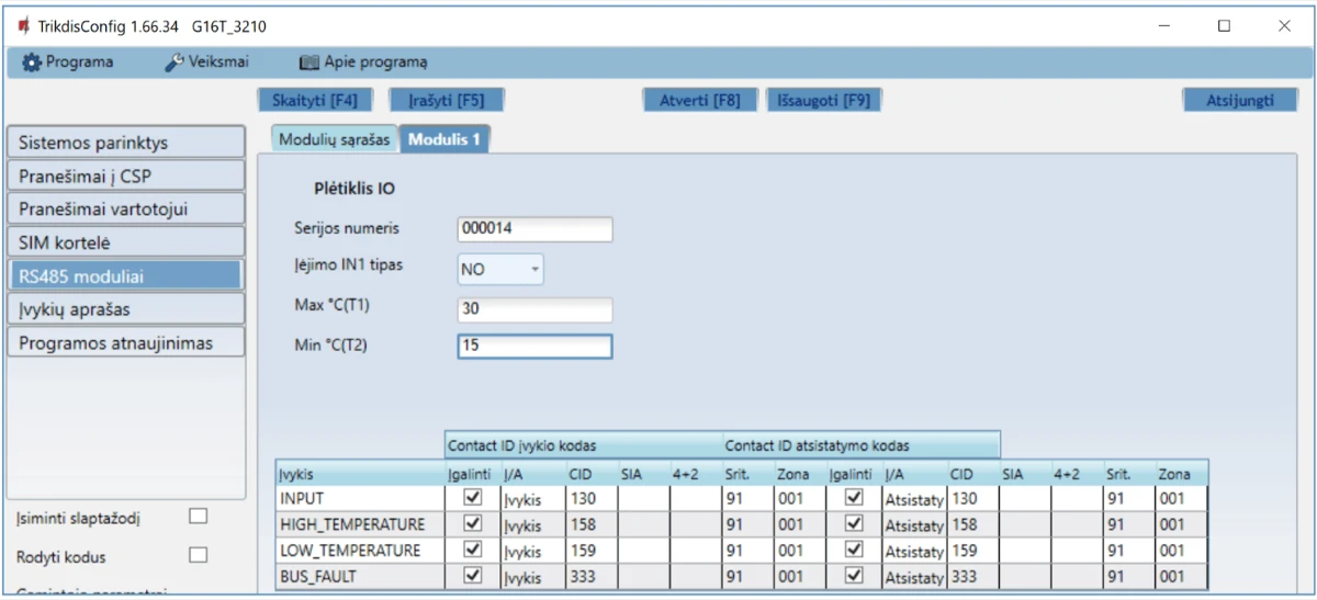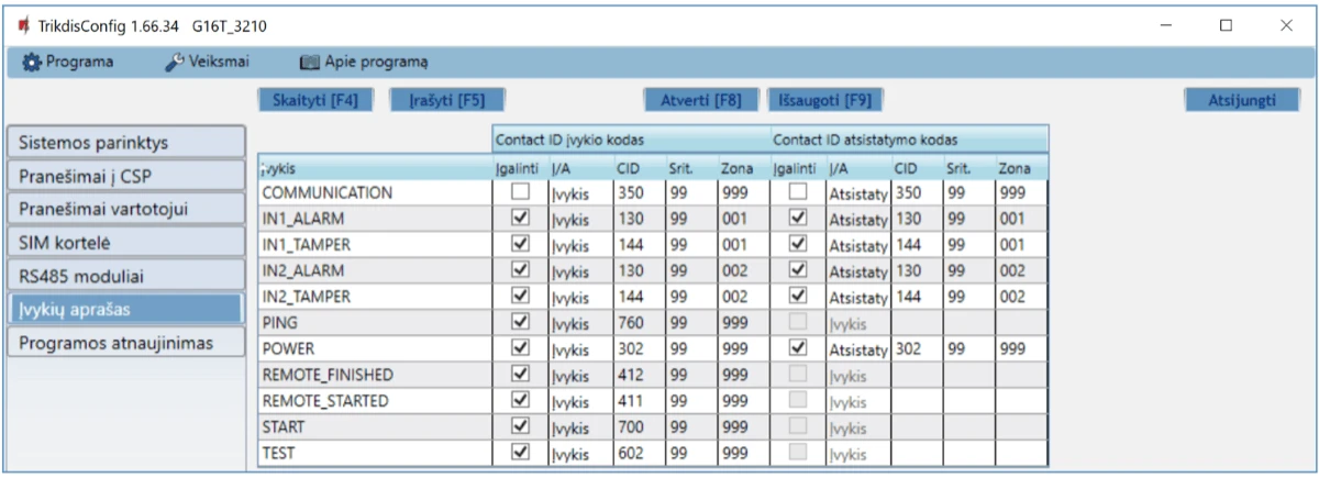 Gali siųsti įvykius į SUR-GARD imtuvus. Priede yra kodų (Contact ID į SIA) keitimo lentelė.