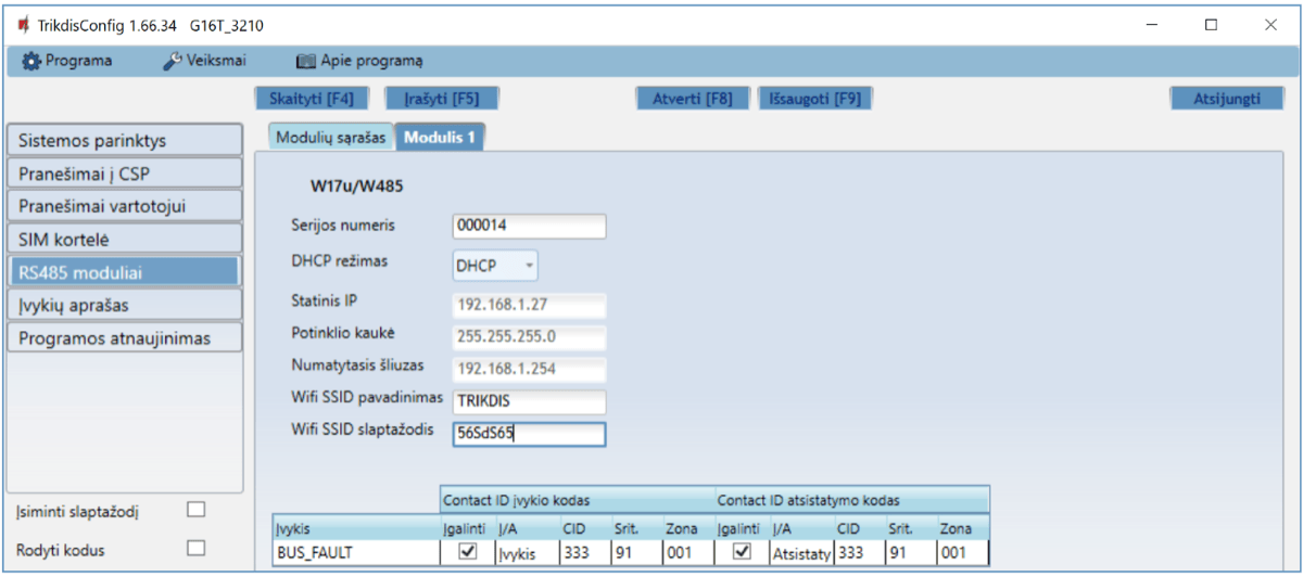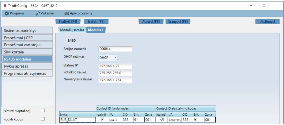 | A 485 | RS485 magistralės A kontaktas |