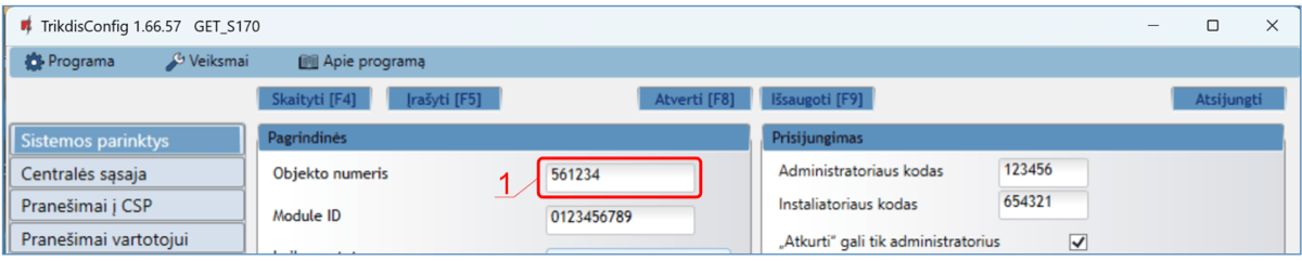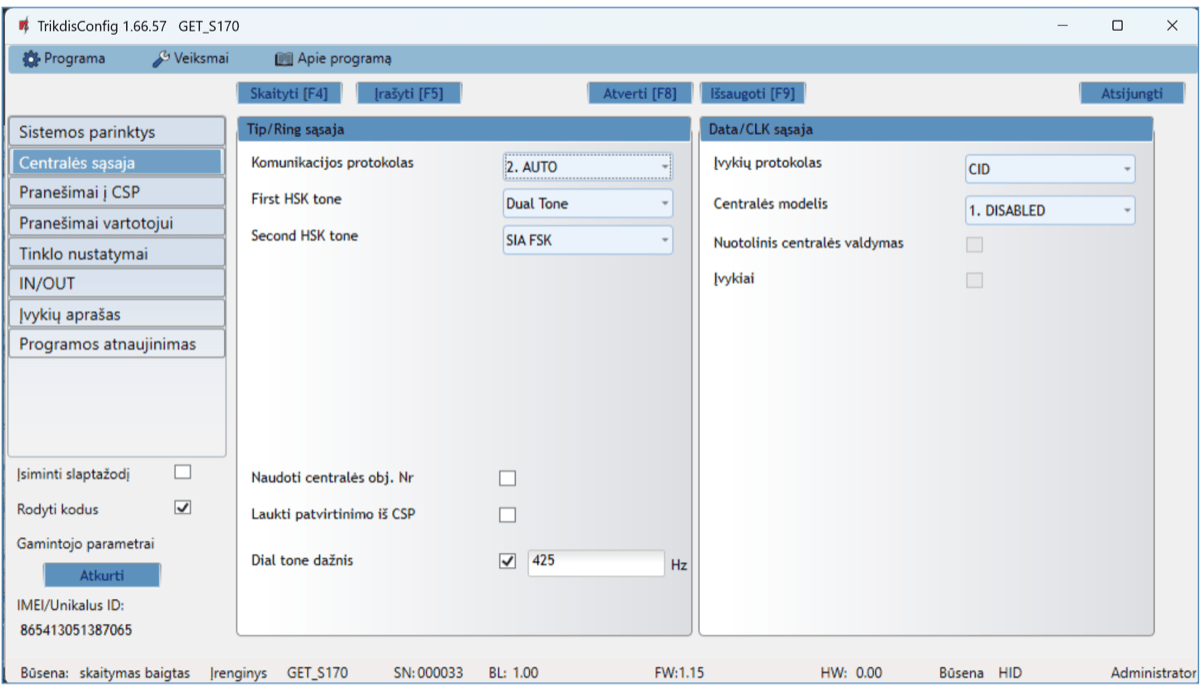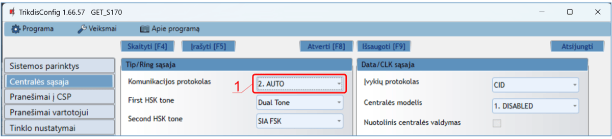 | Prisijungimas prie centralės | Nuoseklioji magistralė arba klaviatūros magistralė arba fiksuotojo ryšio komunikatoriaus (TIP RING gnybtai) |