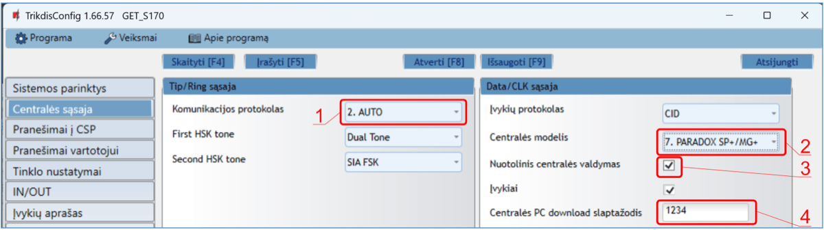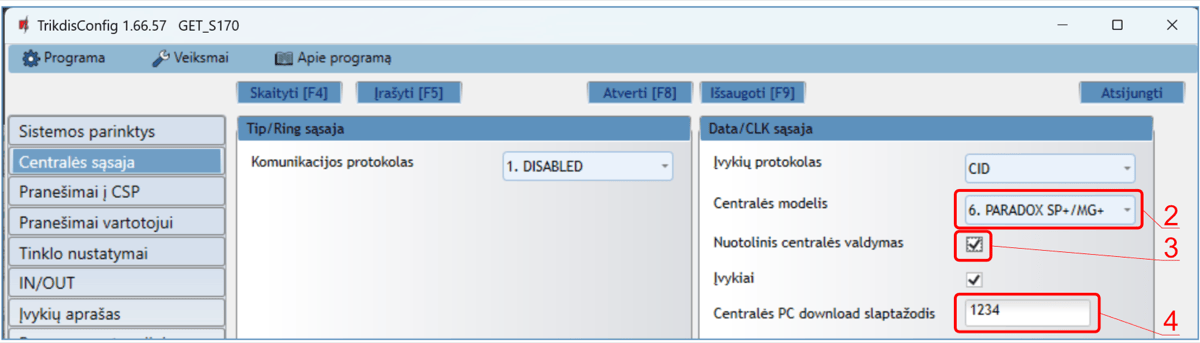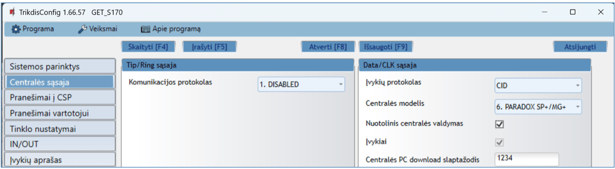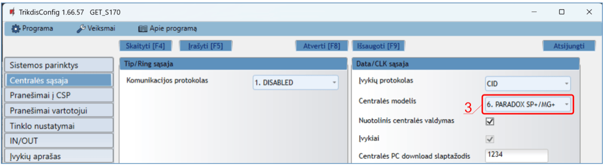 *Pabraukta – centralės, kurios tiesiogiai valdomos komunikatoriaus. Tiesiogiai valdomų PARADOX centralių veikimo programos versija turi būti ne žemesnė nei V.4.