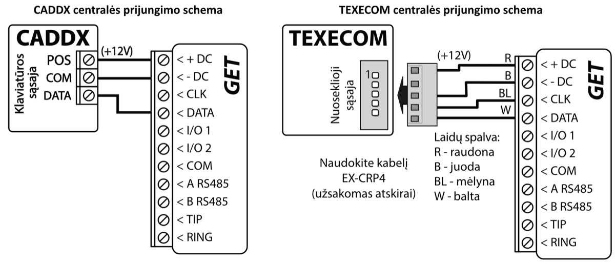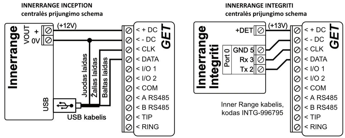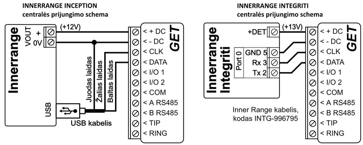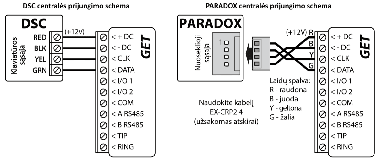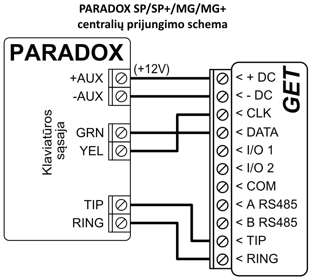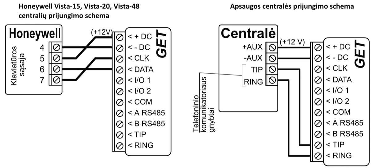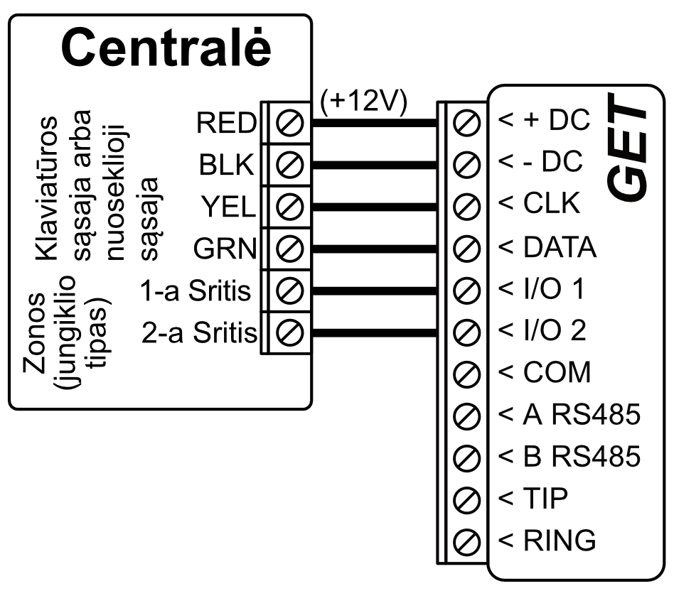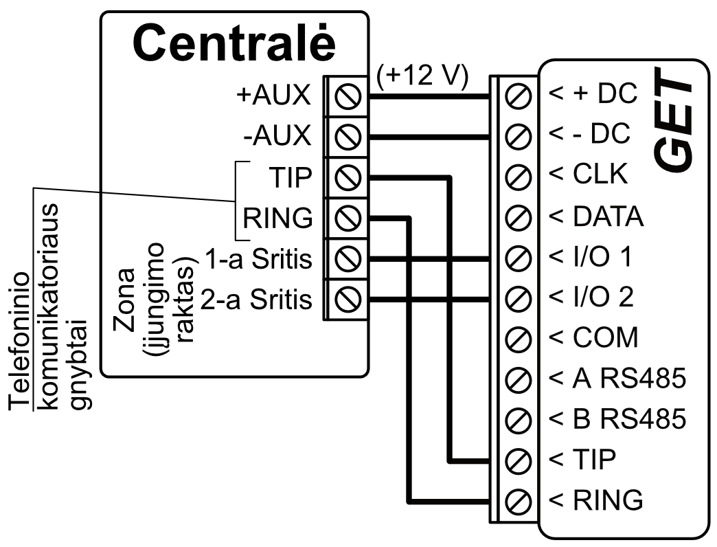 *Kitų gamintojų centrales prijunkite su komunikatoriumi GET naudojant centralės gnybtus TIP RING.