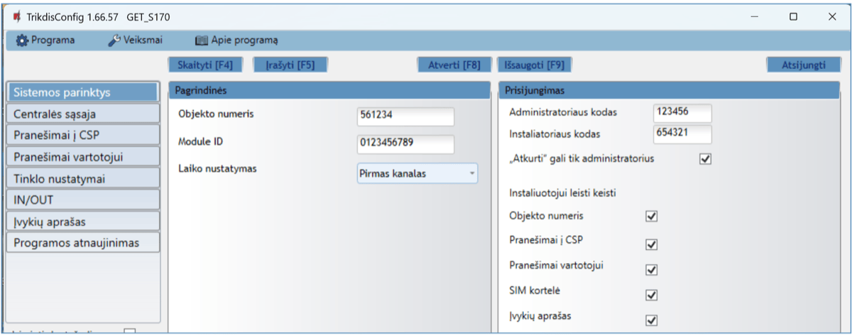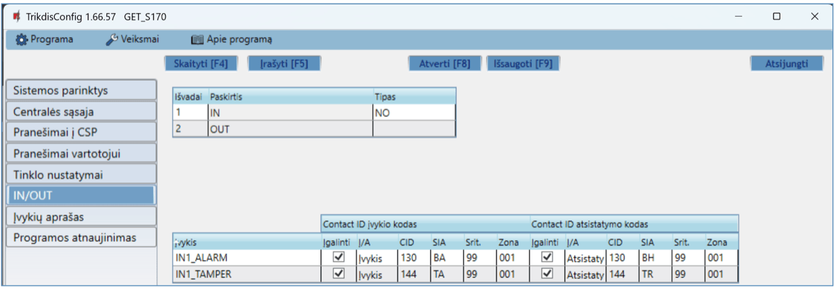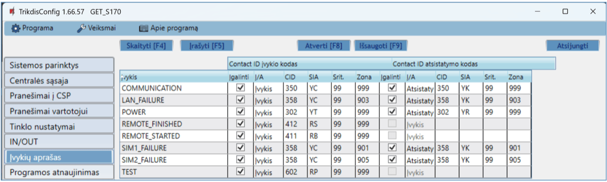 Gali siųsti įvykius į SUR-GARD imtuvus. Priede yra kodų (Contact ID į SIA) keitimo lentelė.