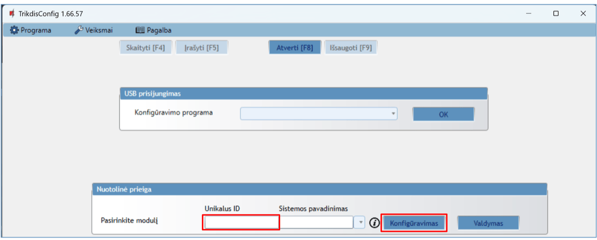 | Veikimo konfigūravimas | Su kompiuterine programa TrikdisConfig nuotoliniu būdu arba lokaliai per USB-C |