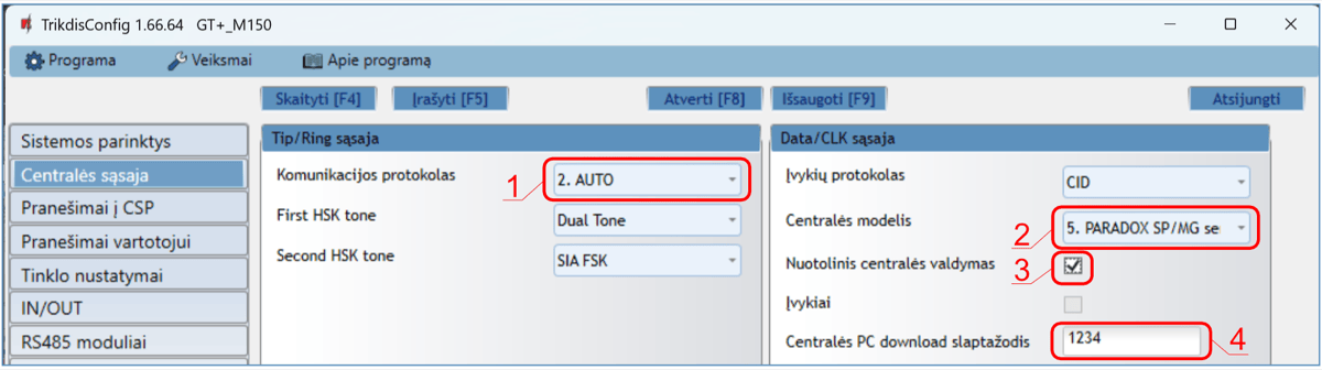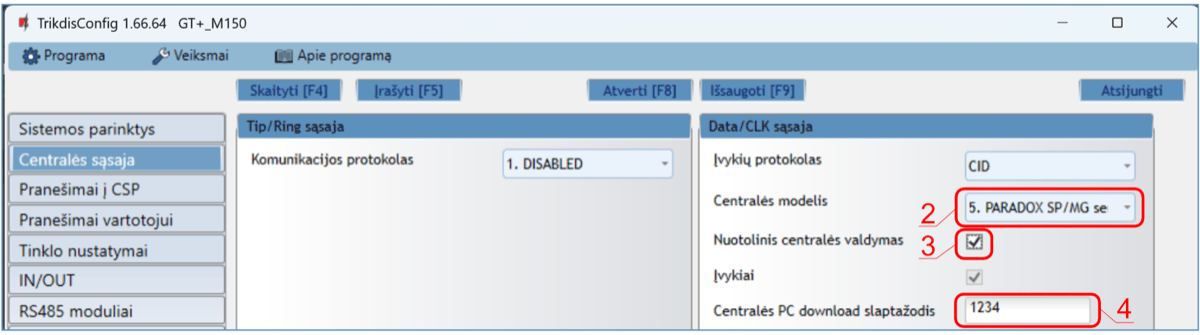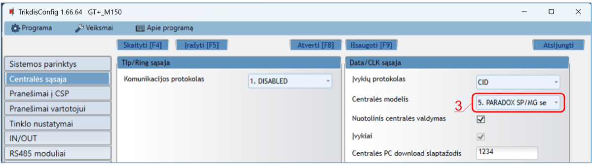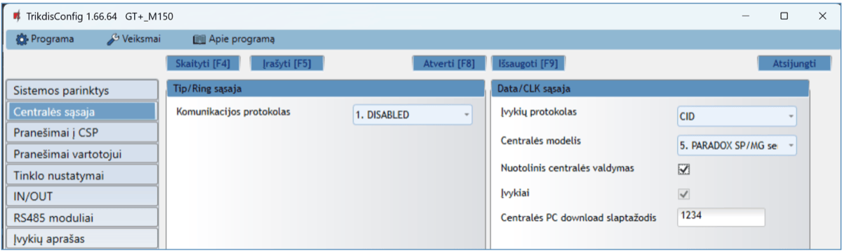 *Pabraukta – centralės, tiesiogiai valdomos su GT+. Tiesiogiai valdomų PARADOX centralių veikimo programos versija turi būti ne žemesnė nei V.4.
