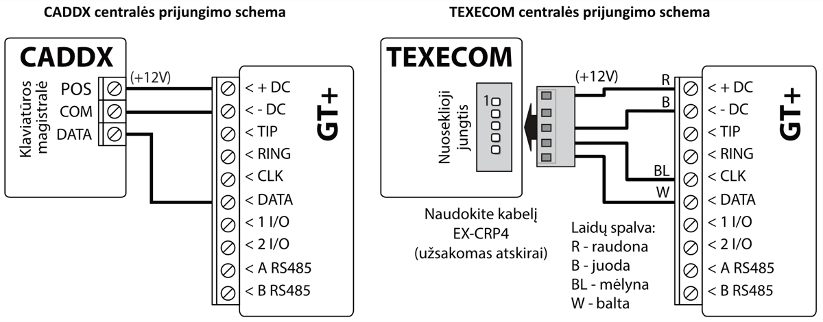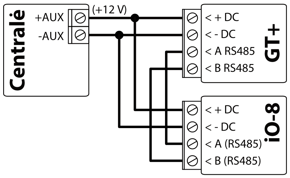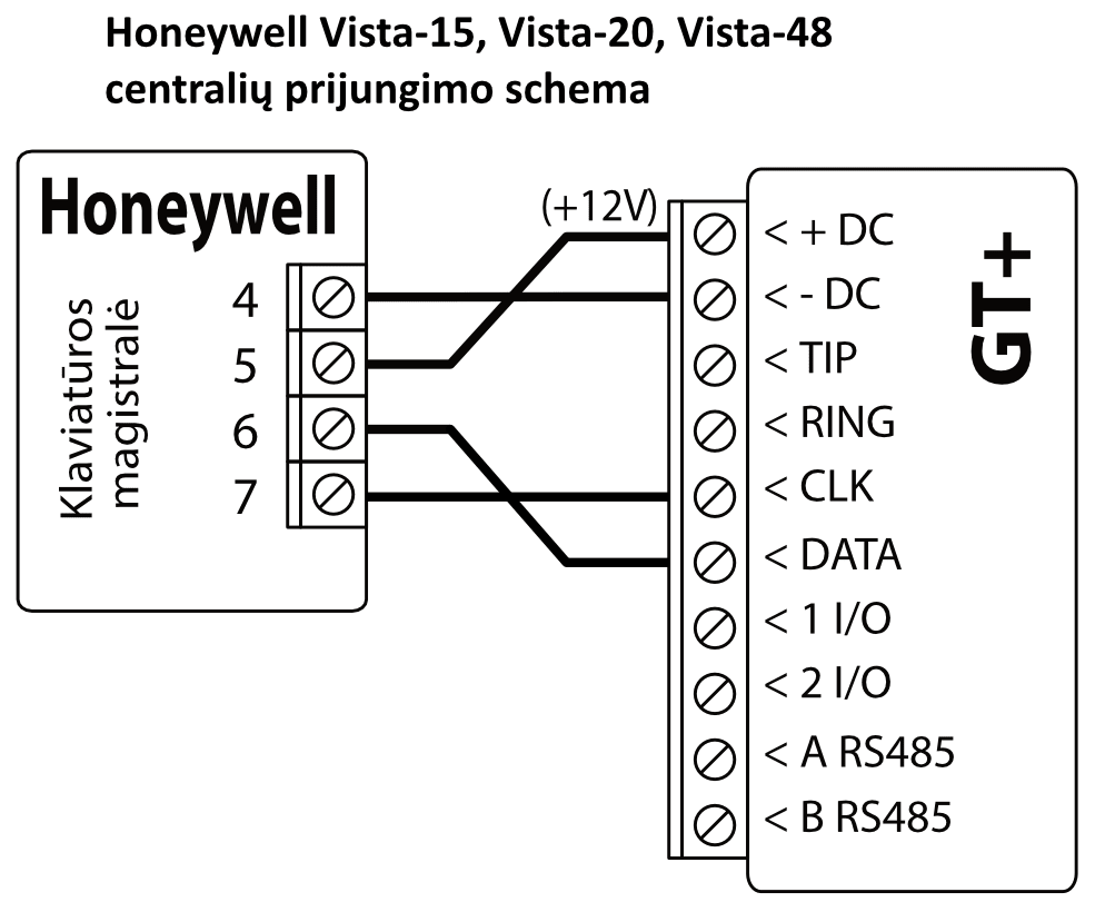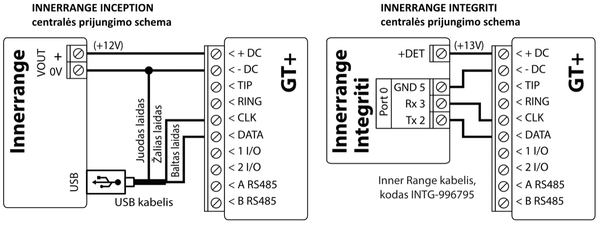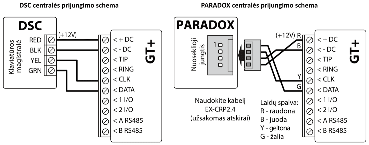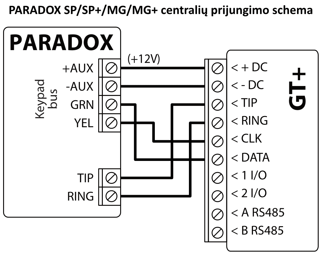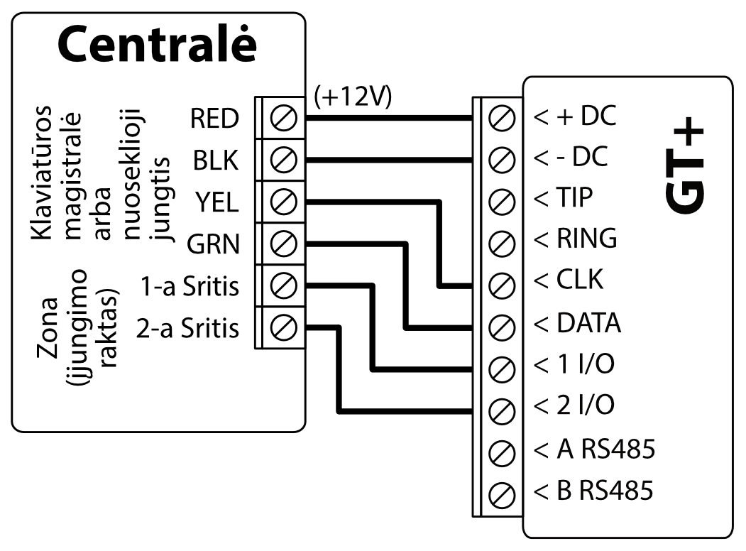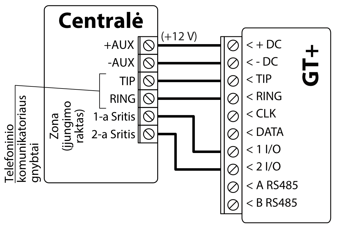 GT+ komunikatorių galima tiesiogiai prijungti prie centralės klaviatūros magistralės arba nuosekliosios magistralės (DSC, Paradox, UTC Interlogix (CADDX), Texecom, Innerrange, Honeywell) arba prie centralės telefono komunikatoriaus (kuris palaiko DTMF tonais perduodamą Contact ID ryšio protokolą).
