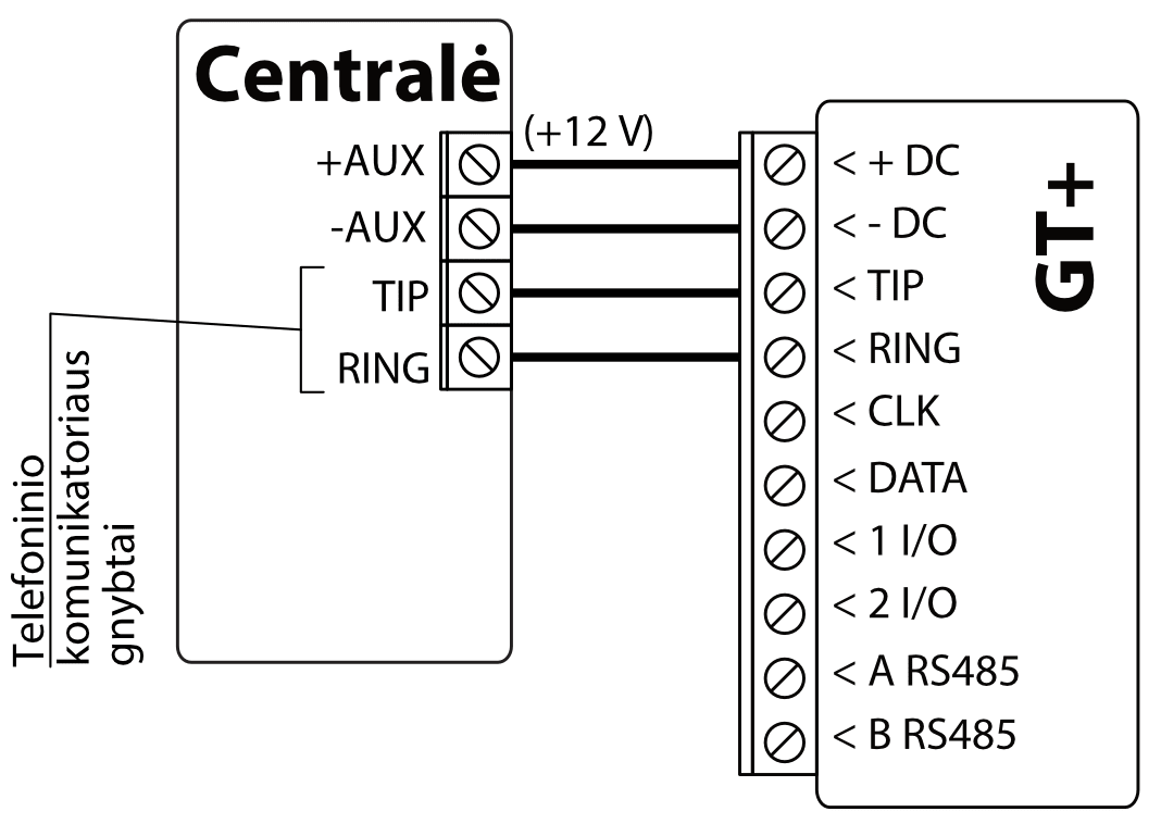*Kitų gamintojų centralės prie GT+ komunikatoriaus jungiasi per centralės TIP/RING gnybtus (kuris palaiko DTMF tonais perduodamą Contact ID ryšio protokolą).