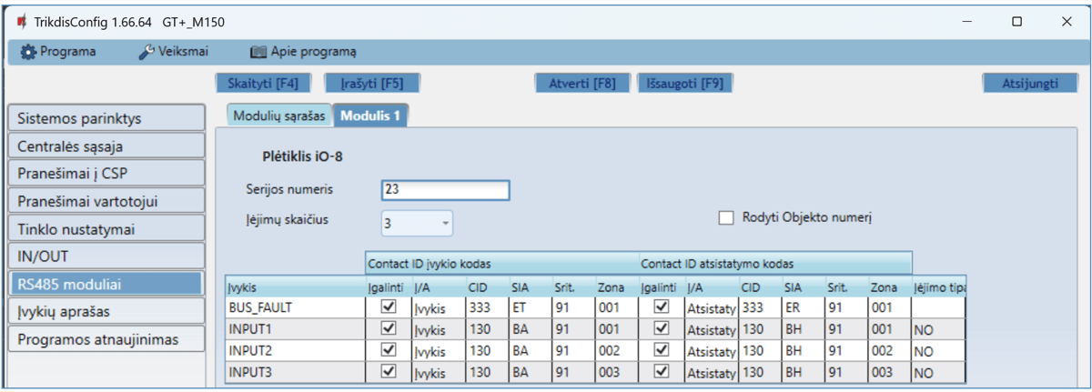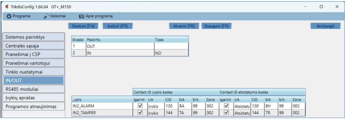 Gali siųsti įvykius į SIA DC-09 imtuvus. Priede yra kodų (Contact ID į SIA) keitimo lentelė.