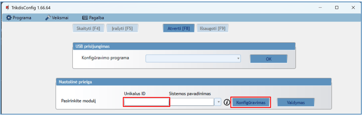 | Veikimo konfigūravimas | Su kompiuterine programa TrikdisConfig nuotoliniu būdu arba lokaliai per USB-С. |