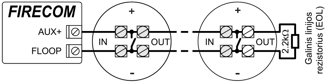 „FLOOP“ įėjimas skirtas 2laidžių priešgaisrinių jutiklių prijungimui.