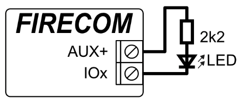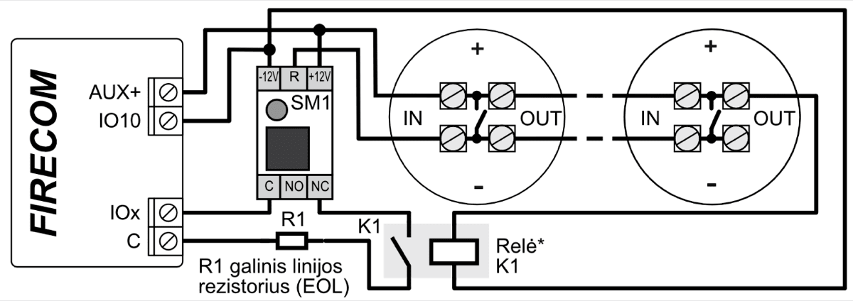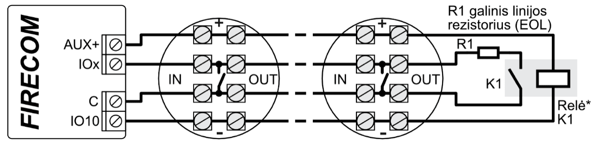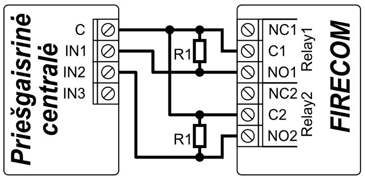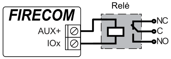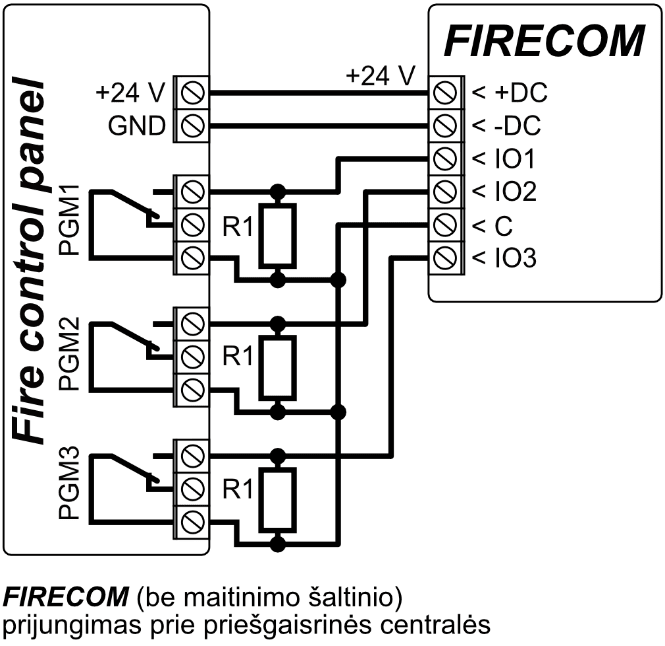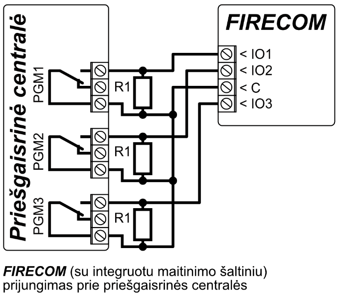 Išėjimas – priskirkite FIRECOM ar išorinio įrenginio OUT išėjimus prie PGM.
