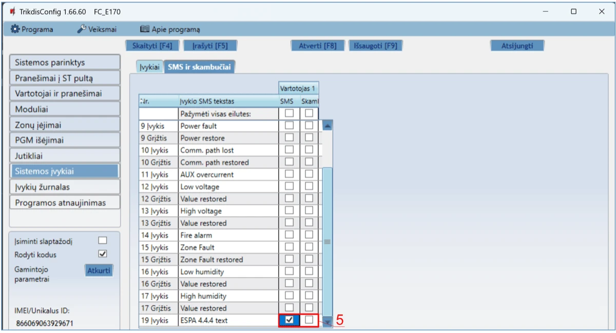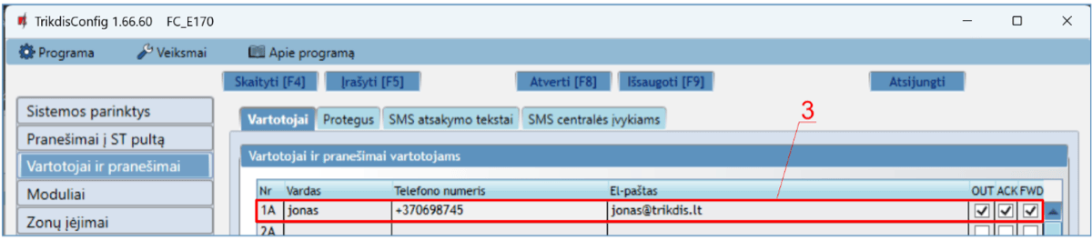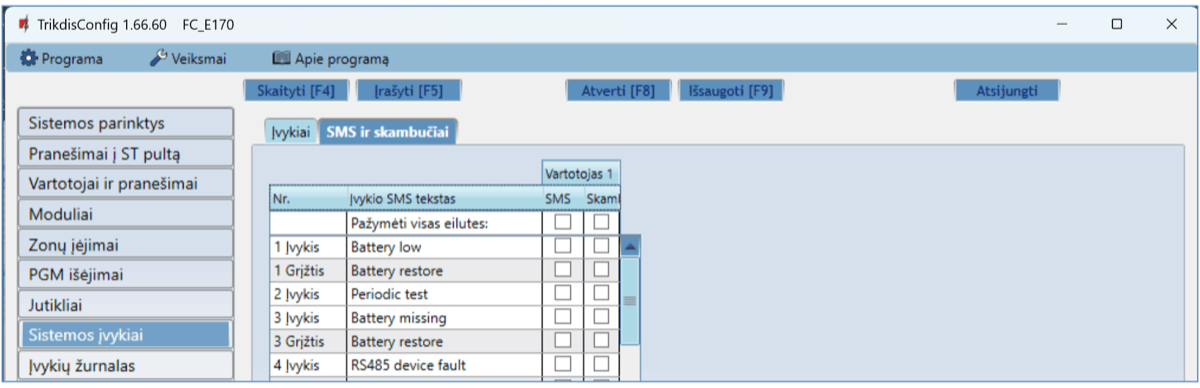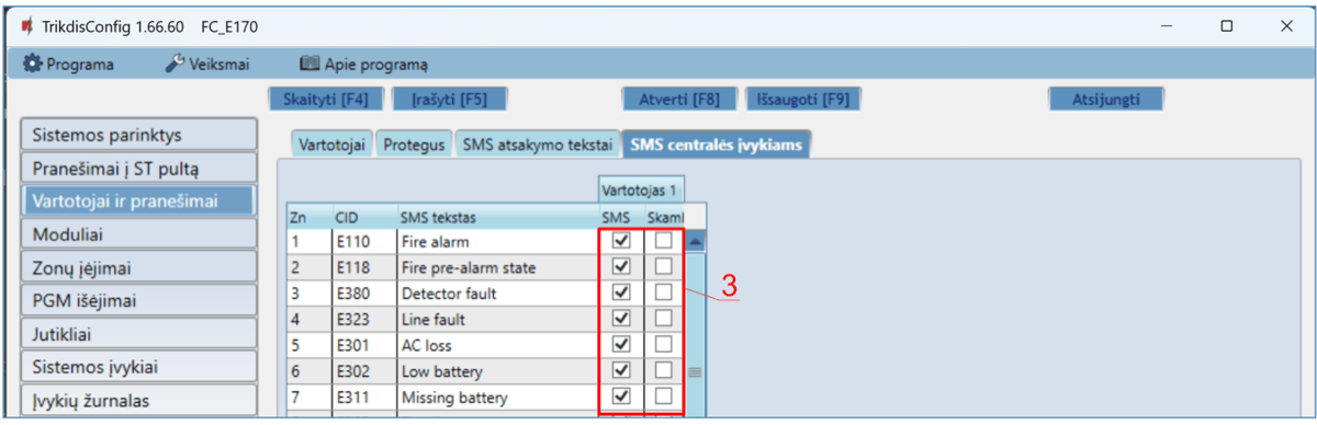 Vartotojas / SMS ir Skambutis - pažymėkite, kokiu būdu vartotojai turi būti informuoti apie kiekvieną įvykį – SMS žinute ir/arba skambučiu.