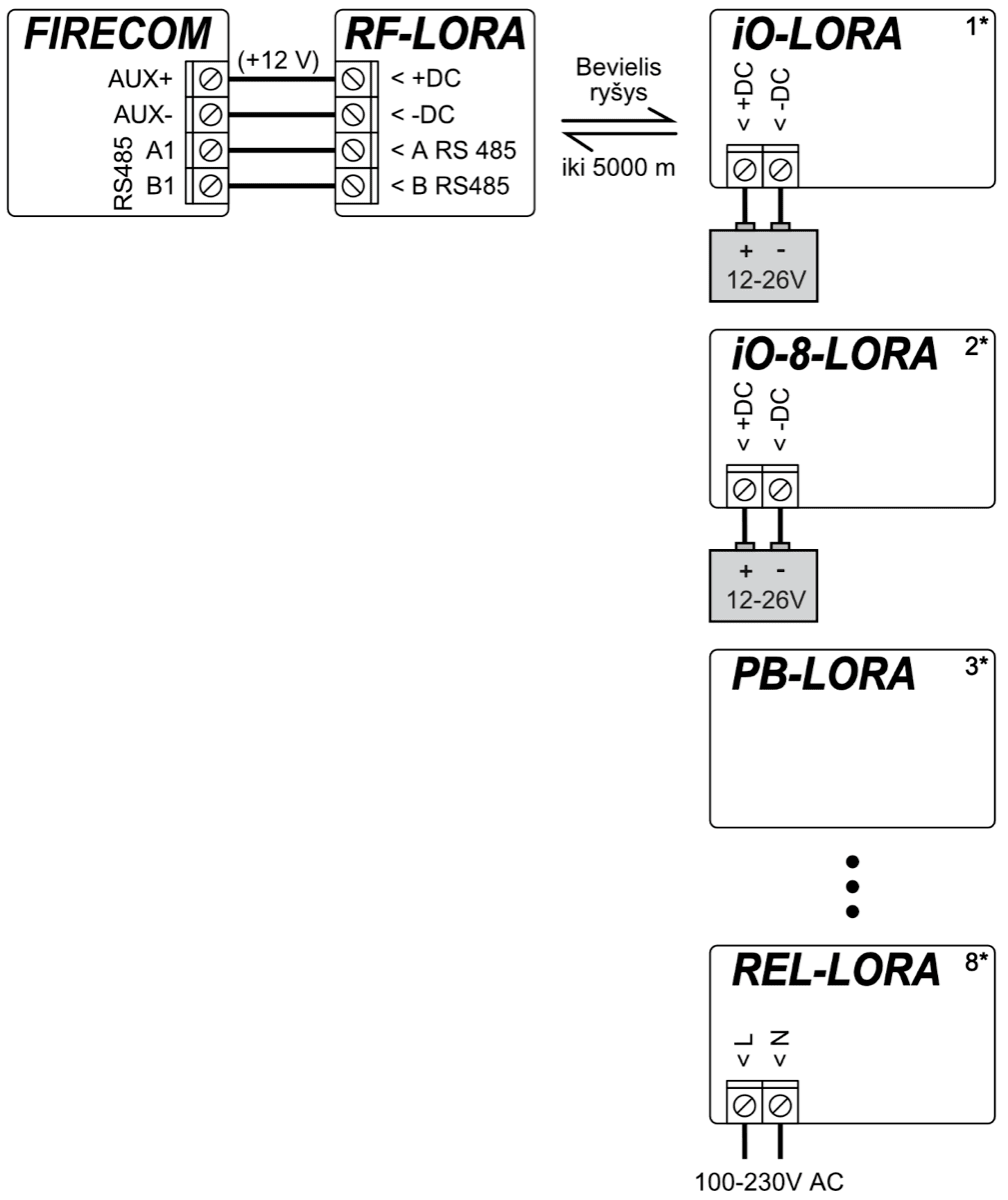 | Palaikomi moduliai | iO-8 - plėtimo modulis; / iO-MO – iO-WL radijo bangų imtuvas; / iO-LORA – plėtimo modulis; / iO8-LORA – plėtimo modulis; / PB-LORA – panikos mygtukas; / REL-LORA - plėtimo modulis; / priešgaisrinė centralė su ESPA 4.4.4 sąsaja; / NSC Solution - priešgaisrinė centralė; / INIM Smartline - priešgaisrinė centralė; / C-TEC Cast ZFP – priešgaisrinė centralė. |