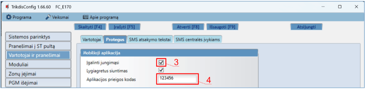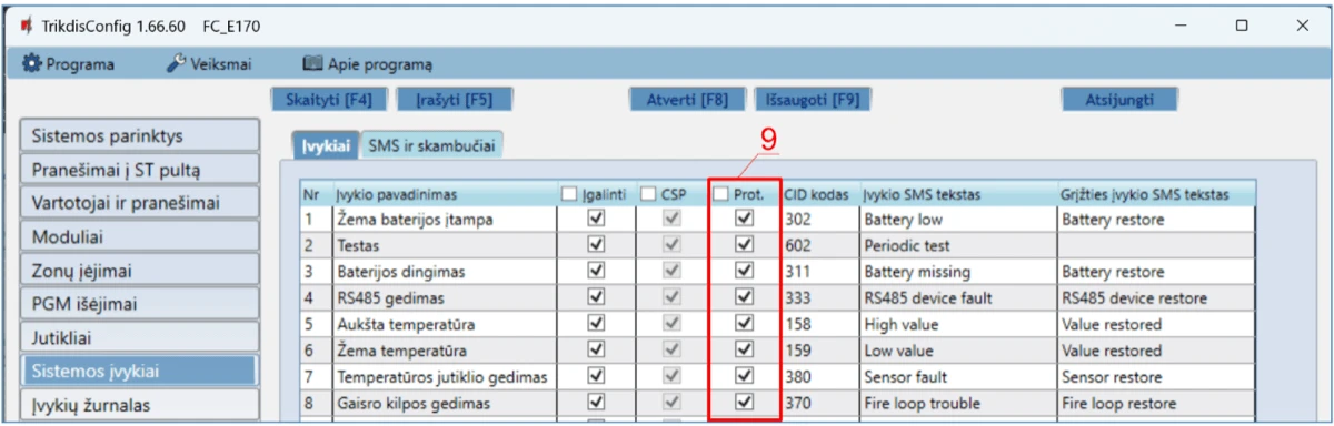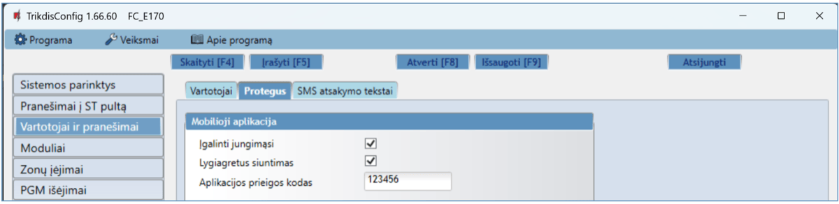 Prot. – parinktų įvykių pranešimai bus siunčiami į Protegus2 programėlę.