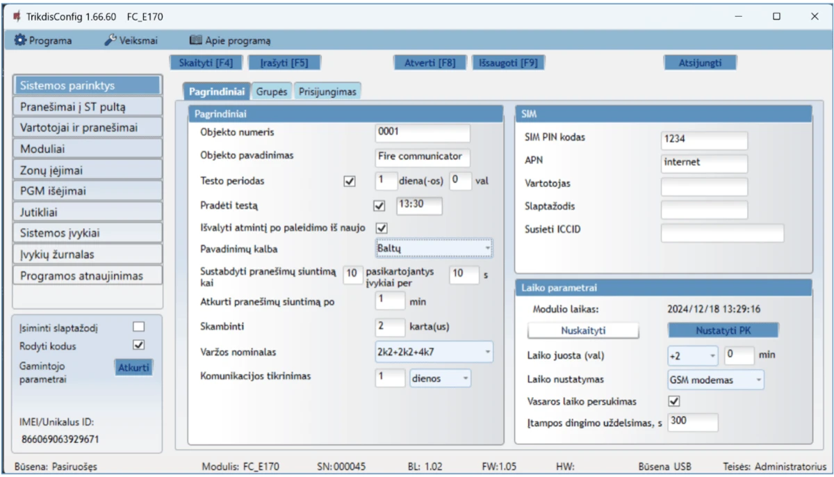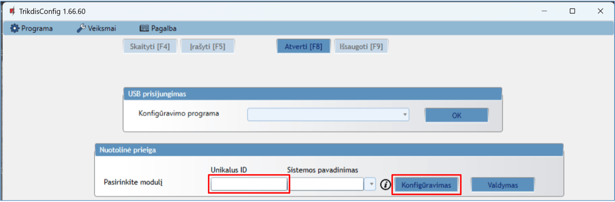 Įrenginio konfigūravimas prijungus USB kabeliu arba nuotoliniu būdu naudojant TrikdisConfig programą.