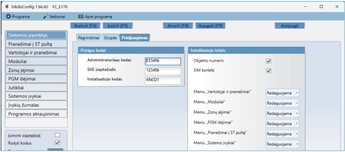 Du parametrų nustatymo lygiai (paskyros): instaliuotojui ir administratoriui.