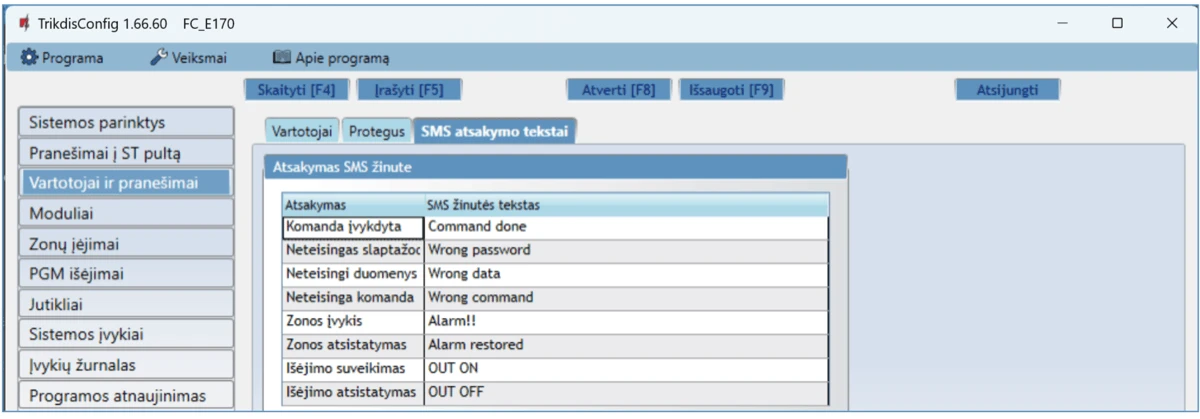 Šis skirtukas bus rodomas, jei bent vienas vartotojo telefono numeris yra aprašytas lange „Vartotojai ir pranešimai". Tik pirmiems 8 vartotojams galima padaryti šios nustatymus.
