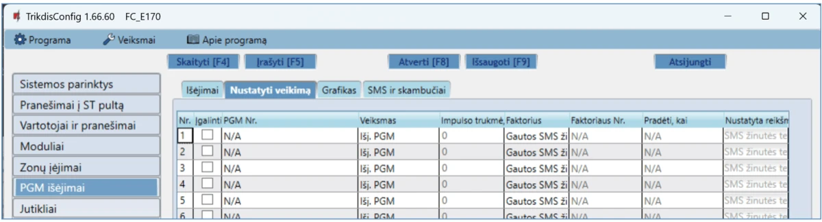PGM Nr. – pasirenkamas norimas PGM išėjimas OUT, kuris bus valdomas įvykus įvykiui nurodytam stulpeliuose „Faktorius“, „Faktoriaus Nr.“, „Pradėti kai“, „Nustatyta reikšmė“.
