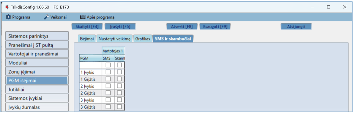Vartotojas / SMS ir Skambutis – galima parinkti, kurį vartotoją SMS žinute ar/ir skambučiu informuoti, kai OUT išėjimas bus įjungtas/išjungtas.