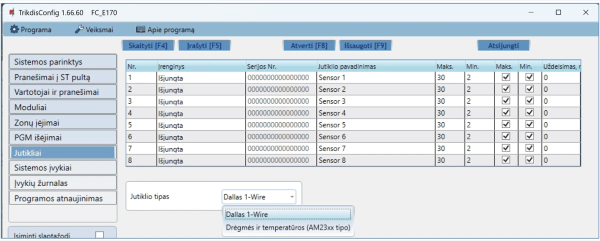 Jutiklio tipas – nurodykite prijungiamo temperatūros jutiklio tipą („Dallas 1Wire“ – galima prijungti 8 vnt. temperatūros jutiklių. Pasirinkus Dallas jutiklius jie bus priregistruojami automatiškai; „Drėgmės ir temperatūros (AM23xx tipo)“ – galima prijungti 1 vnt. AM2301 temperatūros ir drėgmės jutiklį. Pasirinkus „Drėgmės ir temperatūros (AM23xx tipo)“ jutiklį jis turi būti rankiniu būdu priskirtas stulpelyje „Įrenginys“.).