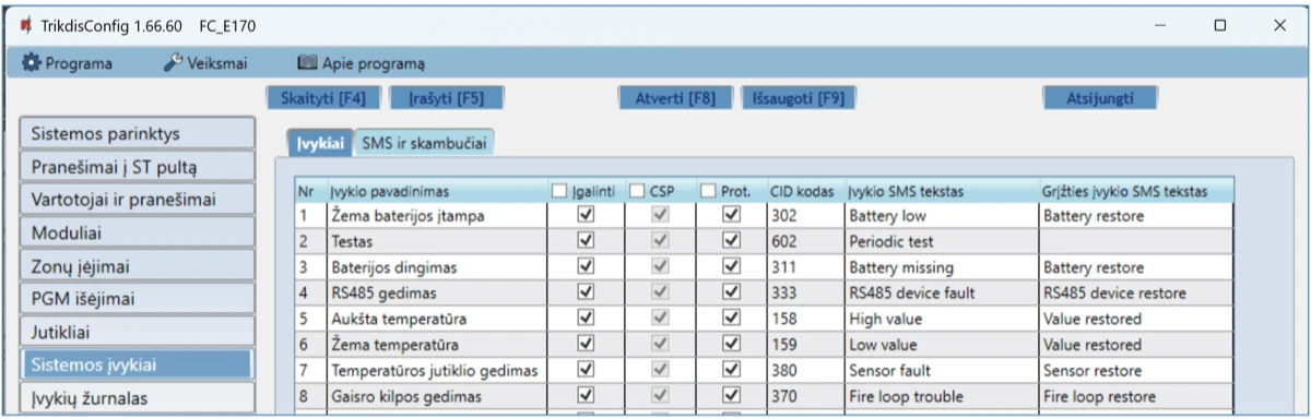 | Įvykių pranešimai | Contact ID, SIA kodai |