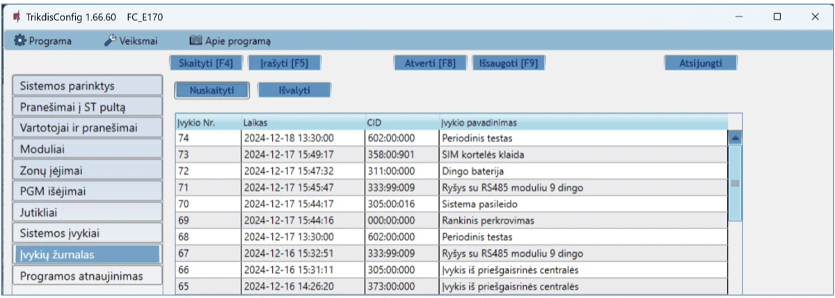 Mygtukas „Nuskaityti“ – komanda, kuria galima nuskaityti įvykių žurnalą iš įrenginio atminties.