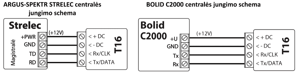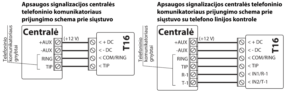 TIP/RING telefono linijos sąsaja gali priimti pranešimus Contact ID ir 4+2 kodais iš centralės.
