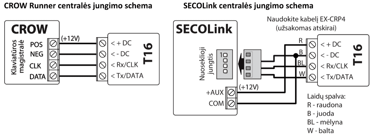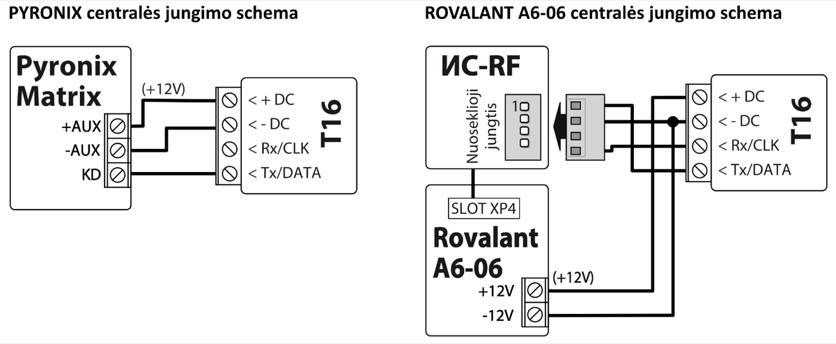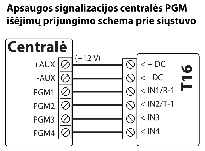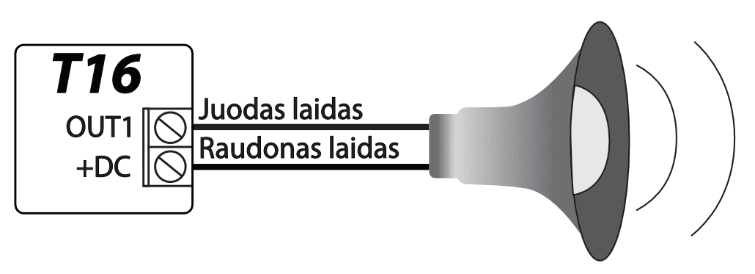 | OUT1 / arba | Išėjimo gnybtas, atviro kolektoriaus tipo, srovė iki 1 A. Gnybtas skirtas sirenai prijungti. (T16V, T16U) |