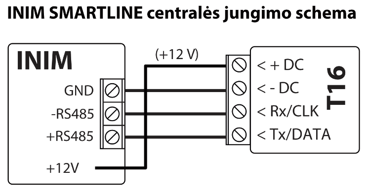 | IN6 / arba | 6 įėjimo gnybtas, pasirenkamo tipo: NC, NO, EOL (2,2 kΩ). (gamyklinis nustatymas NO). (T16V, T16U) |