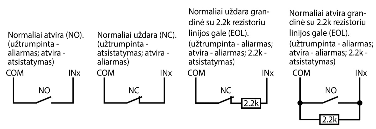 Prie siųstuvo IN išvadų (toliau įėjimų) gali būti jungiama NC, NO ar EOL=2,2 kΩ tipo išorinė grandinė. Pakitus grandinės būsenai arba jai atsistačius į pradinę, siųstuvas išsiųs to įvykio pranešimą.