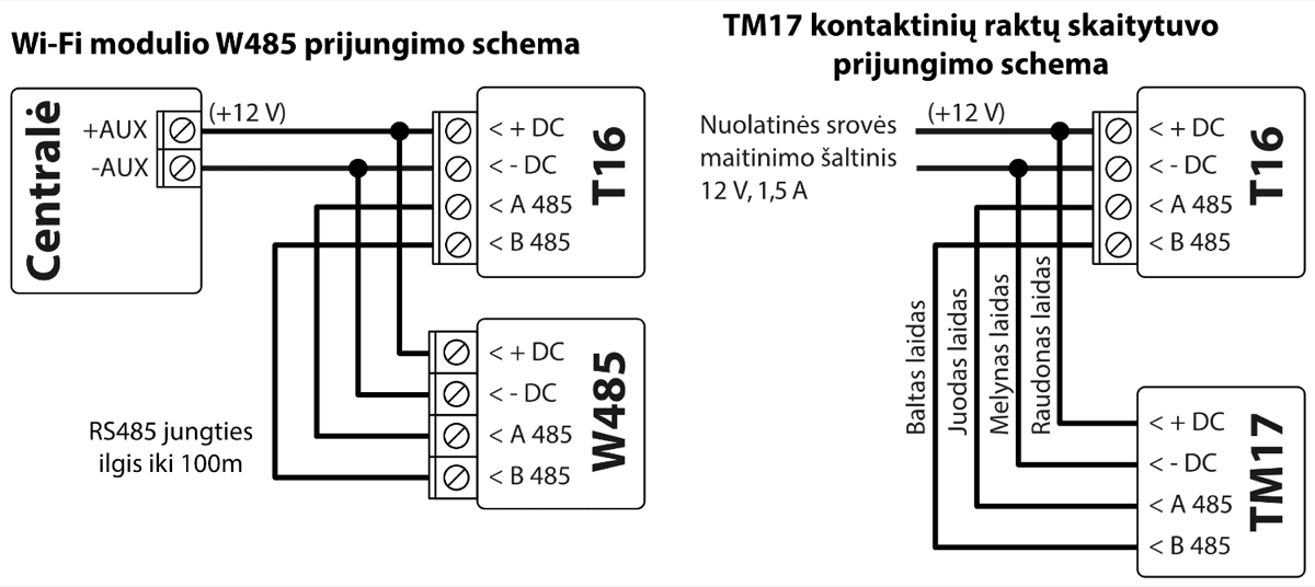 Prie siųstuvo T16 galima prijungti tik po vieną TM17, W485(arba E485) modulius.