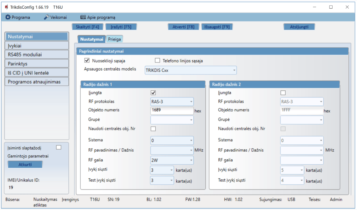 - Radijo dažnis 2 – antro radijo kanalo vidiniu įvykiu kodus, kurie bus siunčiami įvykus įvykiu ir jam atsistačius.