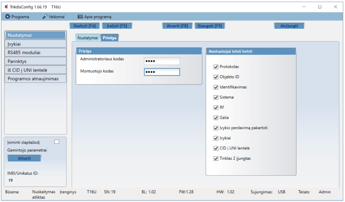 Du parametrų nustatymo lygiai (paskyros), instaliuotojui ir administratoriui.