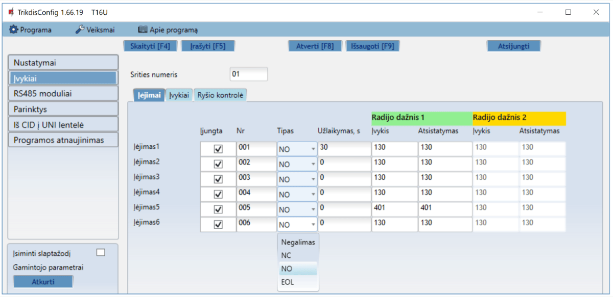 6 įėjimai, pasirenkamas tipas: NC, NO, EOL (2,2 kΩ). (T16V, T16U)