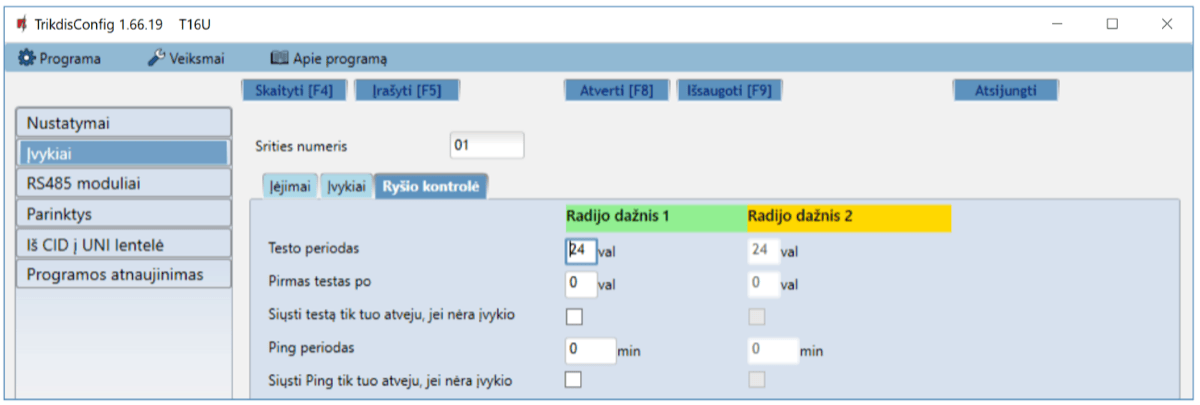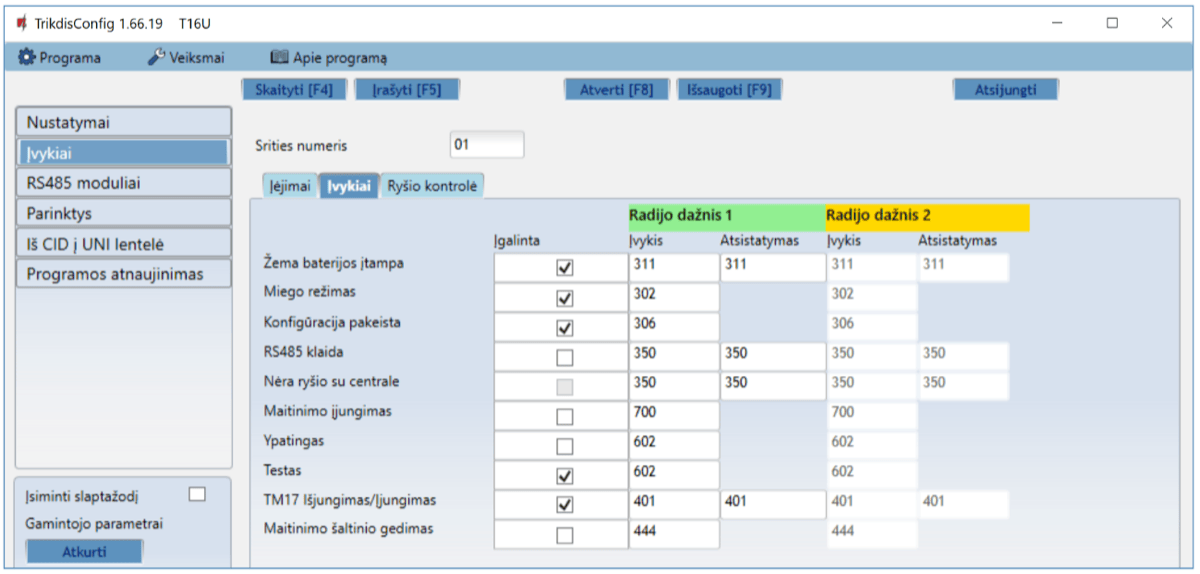 - Radijo dažnis 1 – pirmo radijo kanalo vidiniu įvykiu kodai, kurie bus siunčiami įvykus įvykiu ir jam atsistačius.