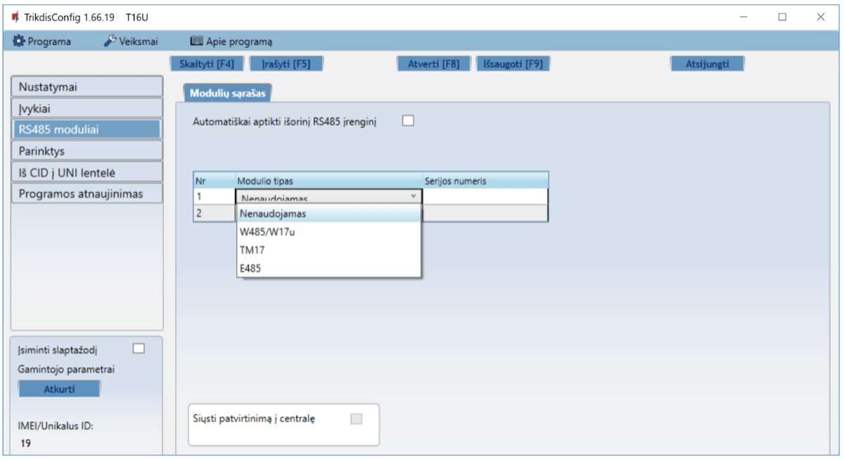 Automatiškai aptikti išorinį RS485 įrenginį – pažymėkite langelį varnele ir bus įjungtas prijungtu moduliu prie RS485 magistralės automatinis atpažinimas.