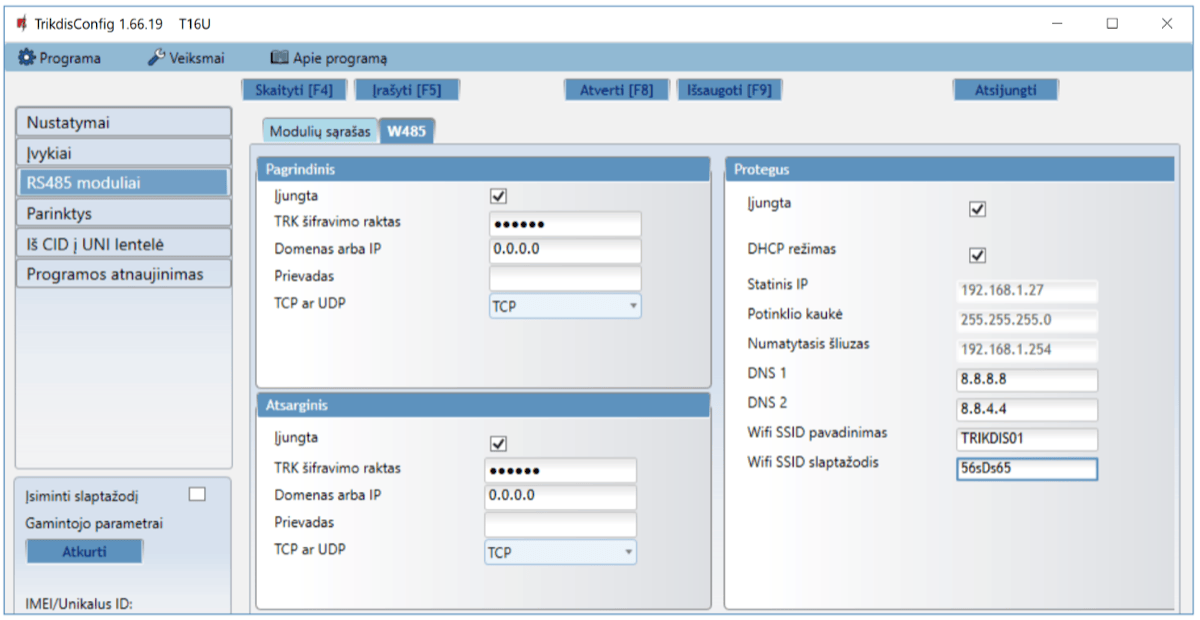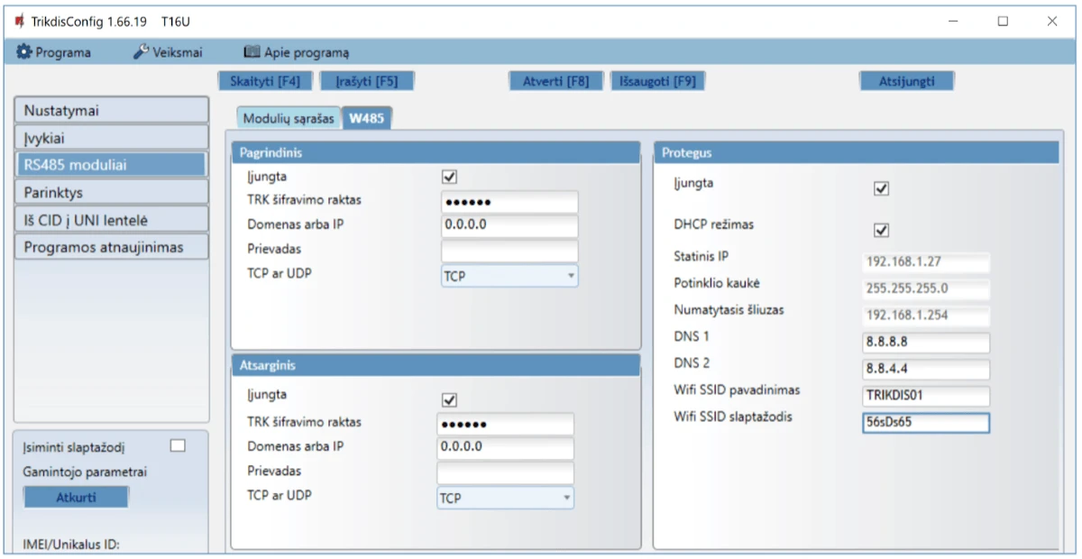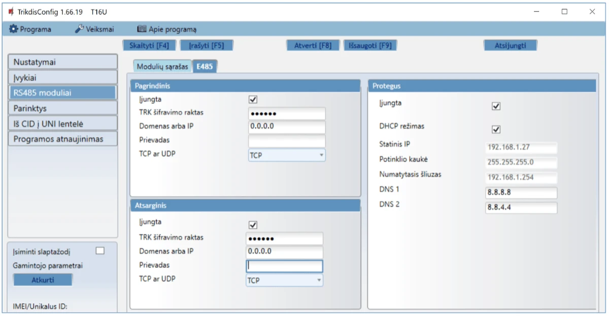 Įjungta - Protegus serviso įjungimas, T16 galės keistis duomenimis su Protegus programėle ir bus galima su TrikdisConfig atlikti konfigūravimą nuotoliniu būdu.
